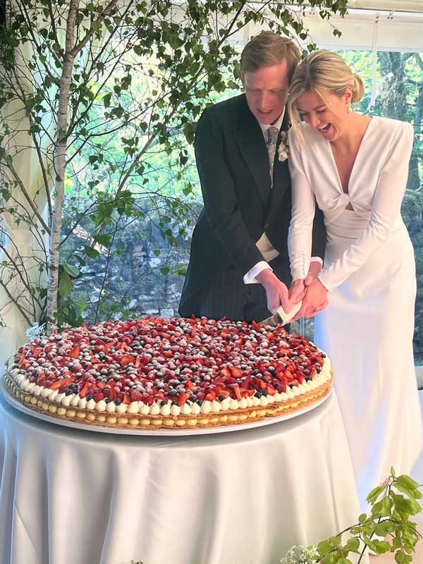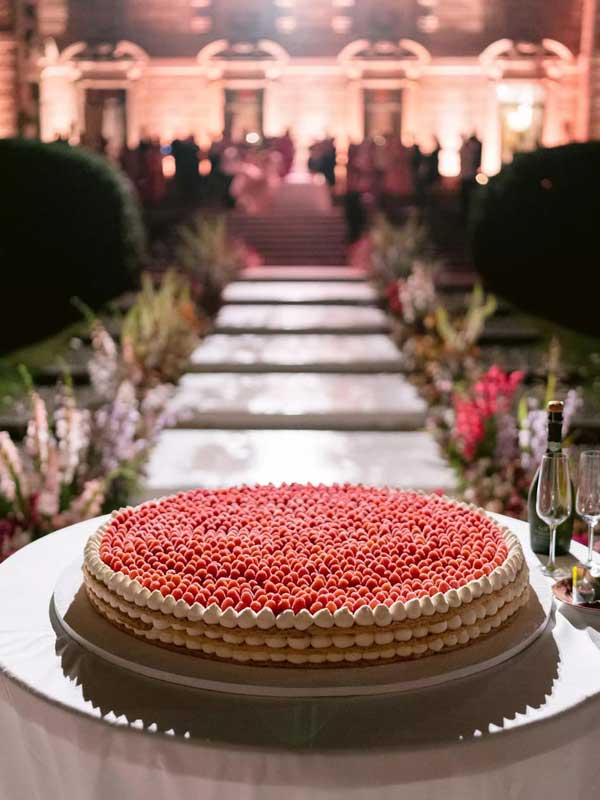 Gâteau de mariage ultra-tendance : millefoglie feuilleté croustillant garni d’une crème légère et recouvert de fruits frais. Finition sucre glace pour un look naturel et élégant. Montage en direct possible pour un instant spectaculaire avant la découpe. Personnalisation des parfums, des fruits et du visuel (fleurs comestibles, meringuettes, feuille d’or). Format disque unique ou plusieurs plateaux selon le nombre d’invités. Service et logistique orchestrés pour préserver le croustillant et la fraîcheur. (Secret Tuscany Weddings)