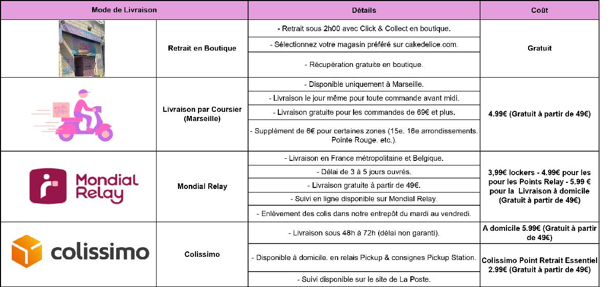 Profitez d'une livraison rapide et fiable à Marseille avec Cake Délice! Commandez avant midi pour une livraison le jour même dans toute la ville de Marseille. Pour seulement 4.99€, nous vous apportons vos délices sucrés directement à votre porte. De plus, bénéficiez d'une livraison gratuite sur toute commande de 49€ ou plus. Attention, pour les commandes à livrer dans les 15ème et 16ème arrondissement, ainsi que certains lieux spécifiques tels que la Pointe Rouge, Luminy, La Valentine, Château Gombert, et divers établissements administratifs et éducatifs, un supplément de 6€ est appliqué. Chez Cake Délice, nous nous engageons à vous offrir le meilleur du matériel de pâtisserie et cake design, avec la commodité d'une livraison rapide et professionnelle.